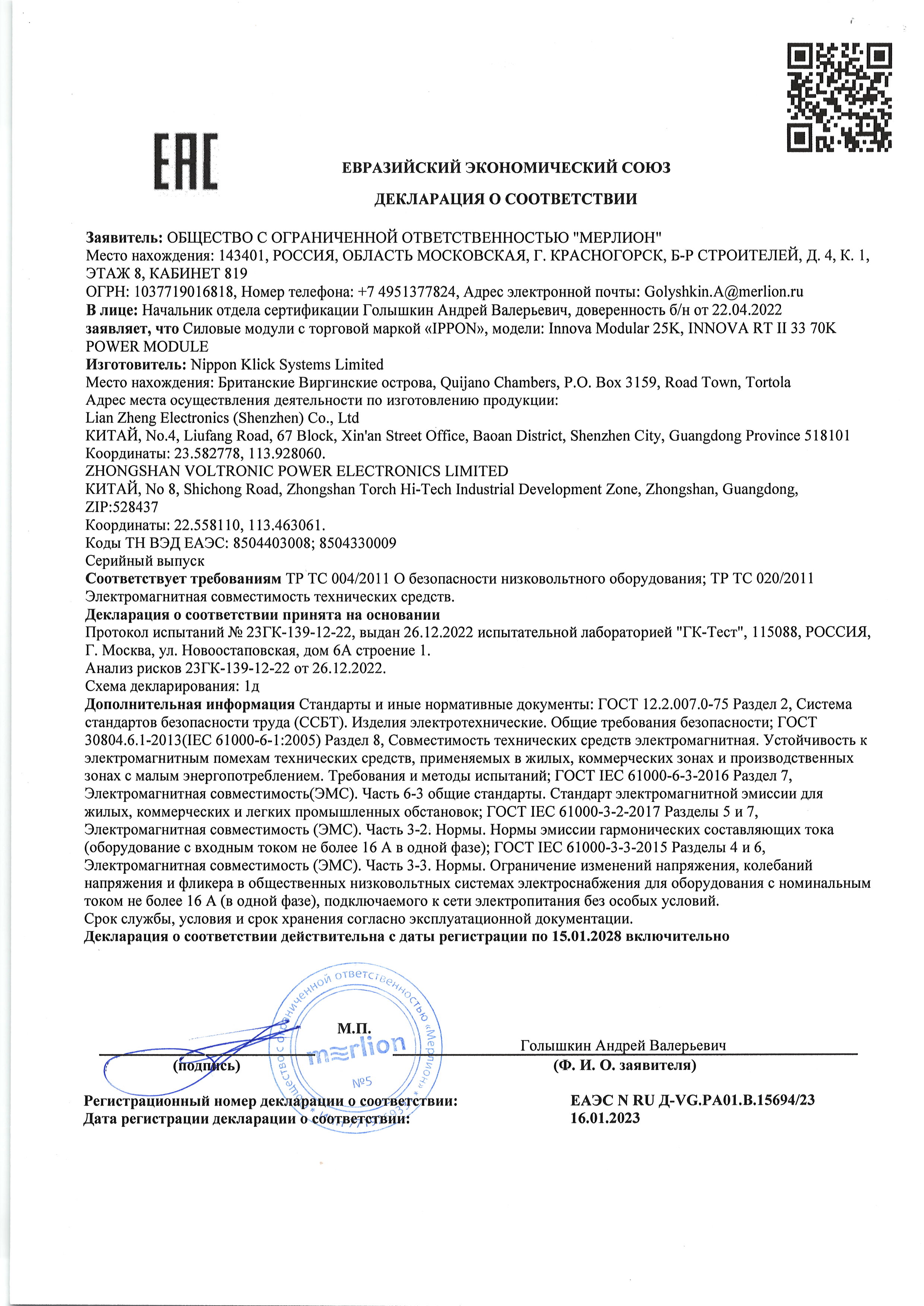 | Силовые модули, модели: Innova Modular 25K, Innova RT II 33 70K Power Module | 16.01.2023 — 15.01.2028 | Скачать | |