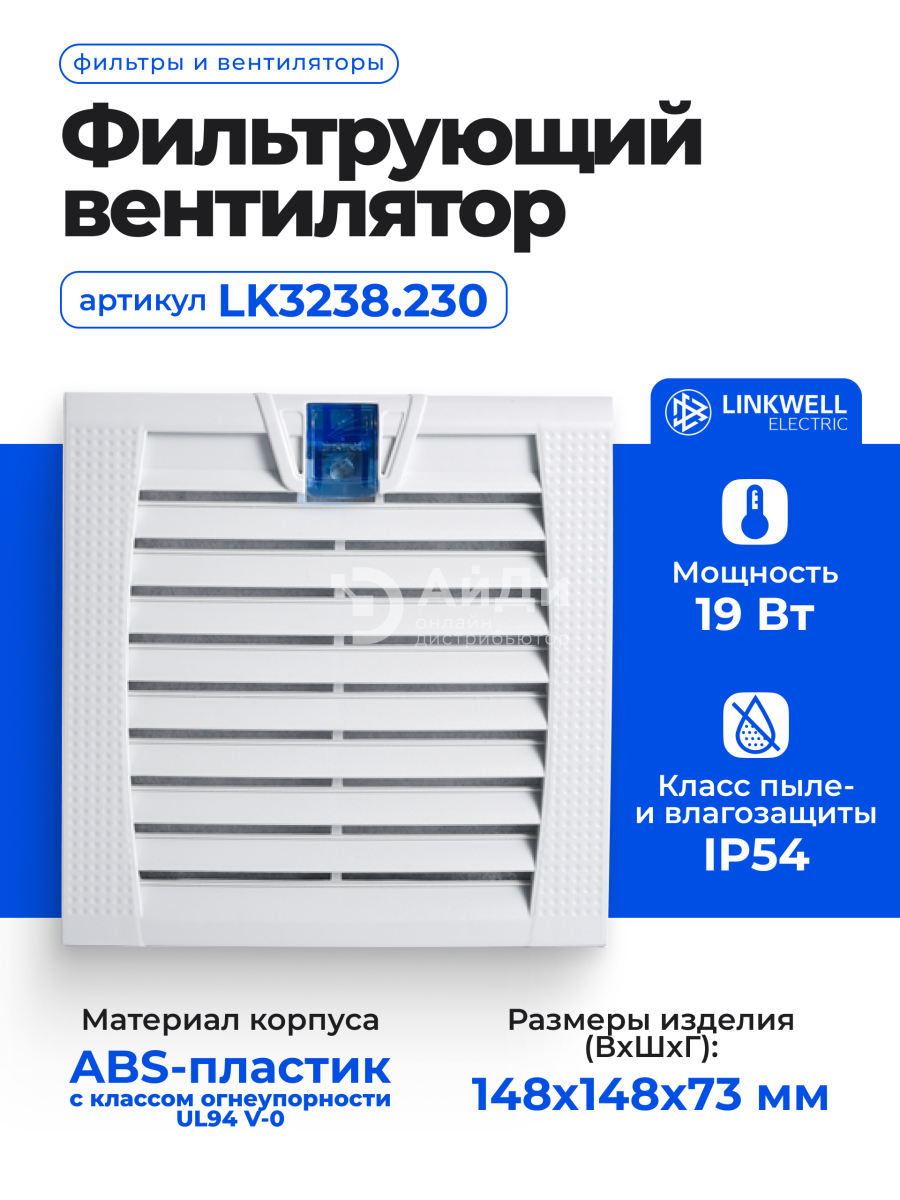 Фильтрующий вентилятор серии LK32 LINKWELL ELECTRIC LK3238.230. Вентилятор удобен при монтаже и эксплуатации. В качестве фильтрующего элемента в устройстве применяется высококачественное волокно полиолефина, корпус выполнен из прочного ABS пластика огнестойкого класса UL94V0.
