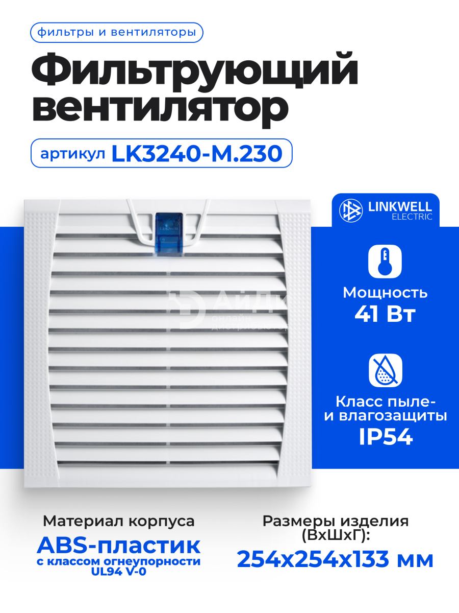 Фильтрующий вентилятор LINKWELL ELECTRIC LK32, с фильтром, 230V, 254х254х133 мм (ВхШхГ), вентиляторов: 1, 41 дБ, IP54, поток: 230 м3/ч, для шкафов