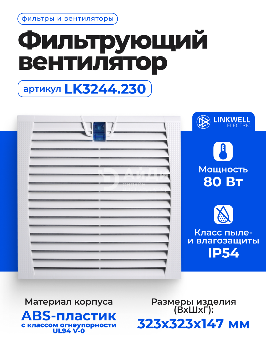 Фильтрующий вентилятор серии LK32 LINKWELL ELECTRIC LK3244.230. Вентилятор удобен при монтаже и эксплуатации. В качестве фильтрующего элемента в устройстве применяется высококачественное волокно полиолефина, корпус выполнен из прочного ABS пластика огнестойкого класса UL94V0.