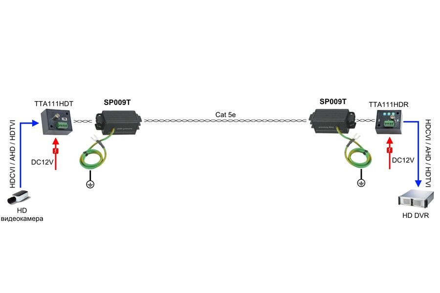 Устройство грозозащиты цепей передачи видеосигналов HDCVI/HDTVI/AHD SMART CABLING (SC&T) SP009T защищает оконечное оборудование при передаче по кабелю витой пары (мониторы, камеры, регистраторы, др.) в системах видеонаблюдения, спутникового телевидения.