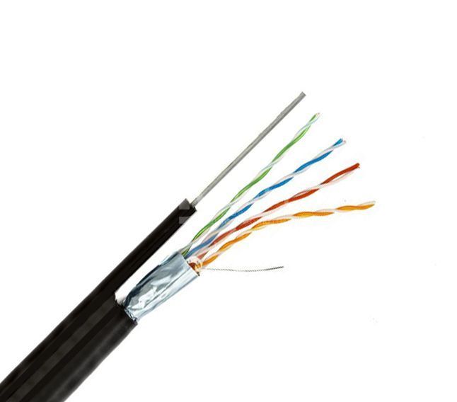 Витая пара FUTP4-C5E-S24-SW-OUT-PE-BK-500 Hyperline с металличнеским тросом, одножильный. Имеет внешнюю оболочку PЕ (полиэтилен). Данный вид витой пары предназначен для прокладки снаружи зданий.