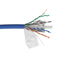 Четыре витые пары обернуты полиэтиленовой пленкой и вместе с одножильным медным заземляющим проводником помещены в общий экран из фольги и оболочку из LSZH-материала.
