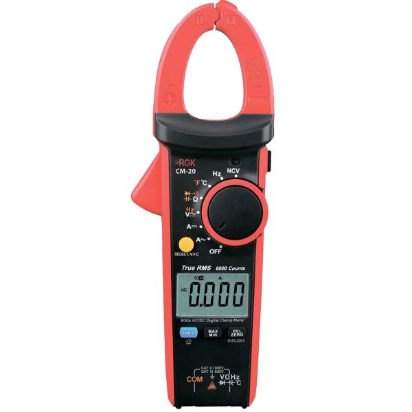 Клещи RGK, (CM-20 + поверка), токоизмерительные, с дисплеем, питание: батарейки, корпус: пластик, измерение тока до 600А, (779692)