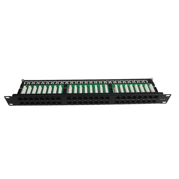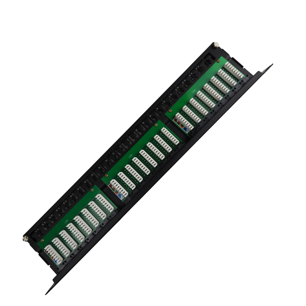С передней стороны патч-панели расположено 48 портов типа RJ-45/8p8c. К ним подключаются патч-корды. Данные порты имеют нумерацию от 1 до 48. Расположенные сзади разъёмы dual IDC предназначены для заделки кабелей витая пара с использованием соответствующего инструмента. К данным разъёмам возможно подключить одножильный кабель 22-26 AWG. Разводку проводников производят по стандартам T568 A и B, что согласуется с цветовой и цифровой маркировкой.