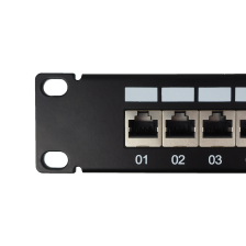 Передняя сторона патч-панели содержит 24 порта RJ-45/8p8c, используемых для подключения патч-кордов. Каждый порт имеет свой номер. Кроме этого, имеются и площадки для размещения дополнительной технологической маркировки.