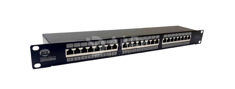 Коммутационная патч-панель RiT Giga, 19", 1HU, портов: 24 х RJ45, кат. 5е, универсальная, неэкр., цвет: чёрный, (R3881124)