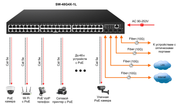 Метод подачи PoE: 1-4 порты – A+B (1,2,4,5+ 3,6,7,8-); 5-48 порты – A (1,2(+) 3,6(-)).