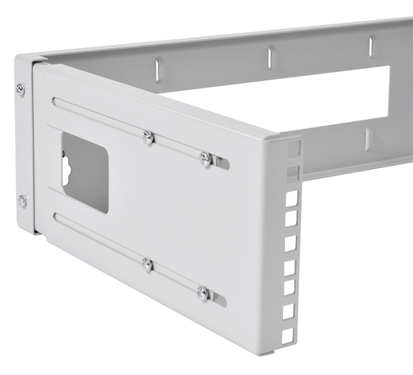 Конструкция горизонтального кронштейна полностью разборная. Он состоит из пяти частей. Элементы крепления обеспечивают повышенную жёсткость конструкции. Задняя и боковые стенки имеют технологические отверстия, служащие для удобства установки оборудования и его облегчённой коммутации.