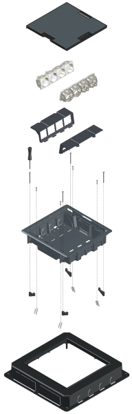 Люк с кромкой Efapel 83008 CAT, предназначен для установки в мягких напольных покрытиях. Установка до 16-и модулей Восемь розеток 45мм х 45мм Фиксаторы в комплекте Цвет антрацит…
