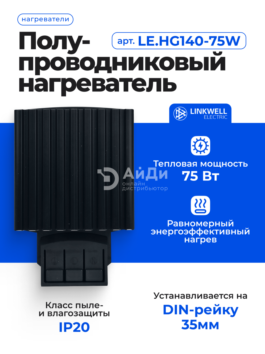 Полупроводниковый нагреватель LINKWELL ELECTRIC HG140-75W мощностью 75 Вт. Предназначен для длительного поддержания требуемой температуры внутри телекоммуникационных и электротехнических шкафов. Напряжение 220В, пусковой ток максимум 4А. Корпус размером (ВхШхГ) 70 x 70 x 50 мм изготовлен из алюминиевого профиля предусматривает естественную тягу, позволяет равномерно прогревать шкаф. Нагревательный элемент – позистор, ограничивающий максимальную температуру, но не исключающий использование терморегулятора. Нагреватель устанавливается на DIN-рейку 35 мм. Подсоединяется трехполюсным зажимом. Предусмотрено использование гибких проводов с наконечниками от 0,5 до 1,5 мм, жёстких проводов от 0,5 до 2,5 мм. Температура эксплуатации и хранения от -45 до +70°C. Степень защиты корпуса IP20.