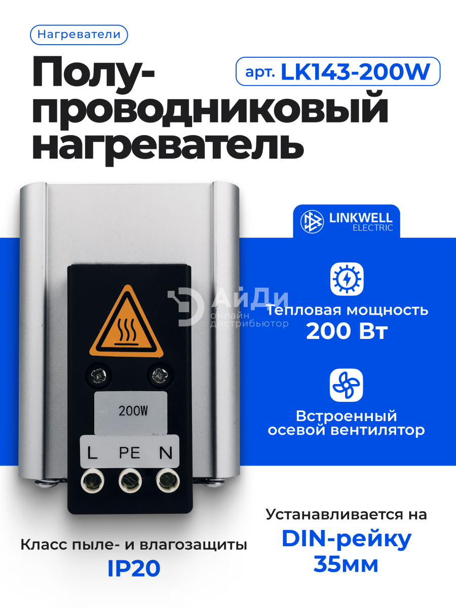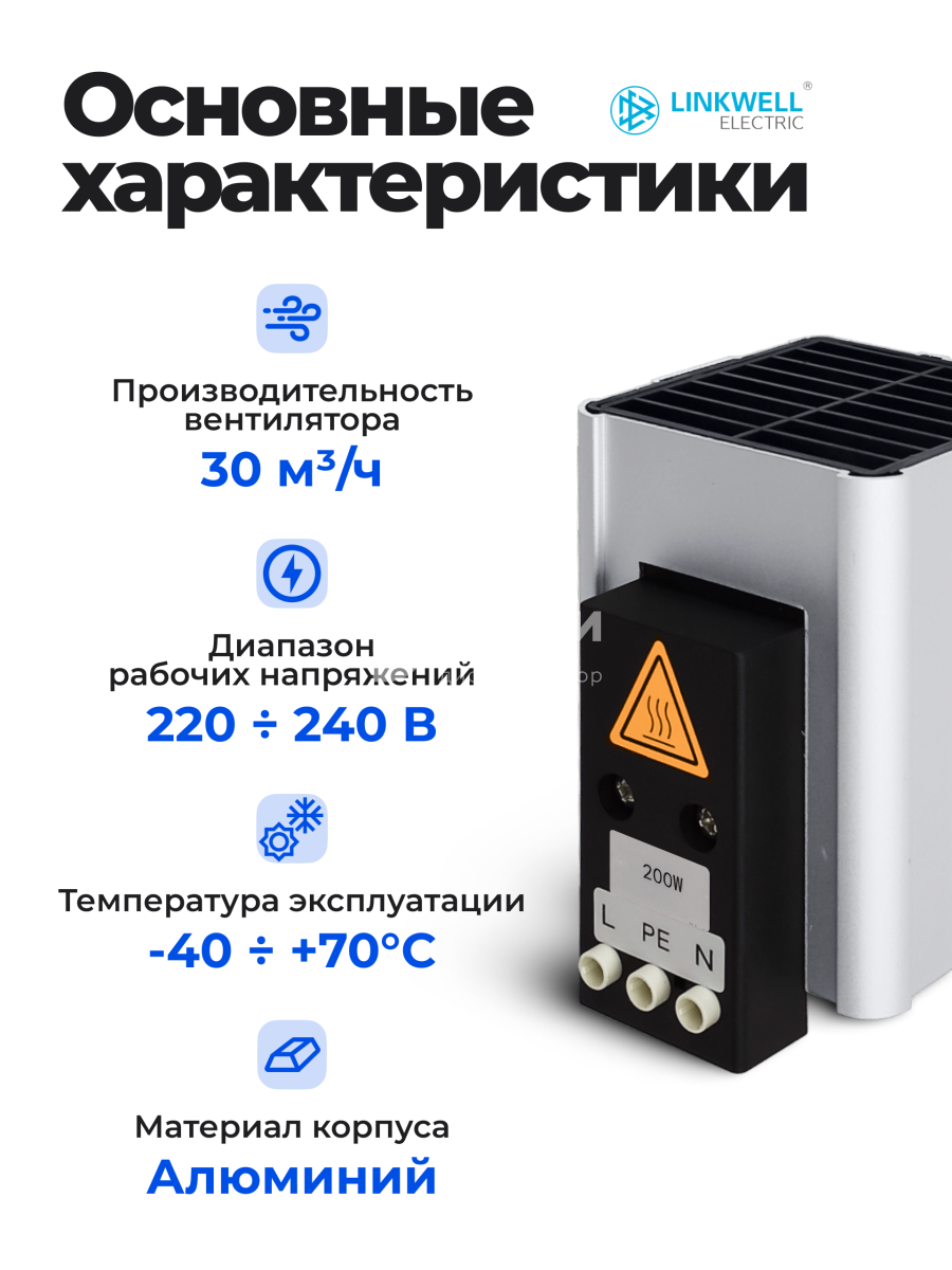 Нагреватель полупроводниковый LINKWELL ELECTRIC LK143-200W, 200 Вт, 220 В, с одним встроенным вентилятором. Устройство помогает сохранять в электротехнических и телекоммуникационных шкафах необходимую температуру.