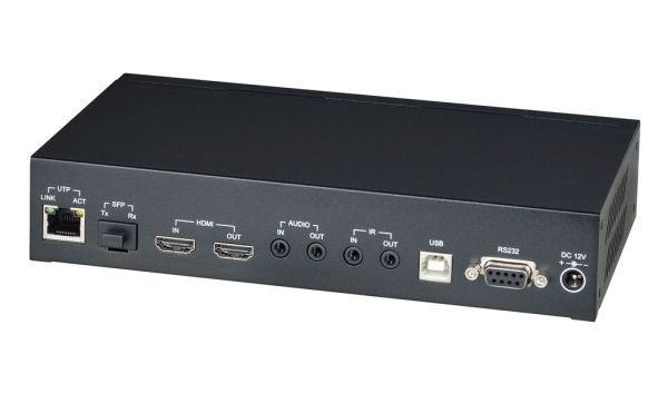 Подключение: HDMI-A (вх.)х1; HDMI-A (вых. лок.монитор)х1; TRS 3,5мм (аудио вх)х1; TRS 3,5мм (аудио вых)х1; TRS 3,5мм (ИК)х2; DB9 (RS232)х1; USB-Bх1; RJ45х1; Fiber (SFP); DC5.5мм (розетка).
