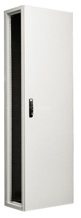 Шкаф с базовой конфигурацией: каркас шкафа, передняя дверь с замком типа «doppelbart» (без ручки), задняя стенка, монтажная панель на всю высоту шкафа, верхняя плита, комплект наборной заглушки нижней плиты. Боковые стенки, цоколь, рым-болты, поворотная рама и другие элементы дополнительного оснащения заказываются отдельно. Сборная конструкция, с использованием замкнутых профилей обеспечивает высокую стабильность. Форма профилей обеспечивает полную симметрию корпуса шкафа, что позволяет производить монтаж дверей и стенок в любой боковой плоскости. Каждый профиль имеет перфорацию с шагом 25 мм, в двух плоскостях, что облегчает монтаж оборудования внутри шкафа. Используемый материал даёт повышенную устойчивость к коррозии и улучшает гальваническую связь неокрашенных элементов, которые крепятся непосредственно к каркасу. Это позволяет нам избежать дополнительных заземляющих соединений. Перфорация рассчитана на использование самонарезных винтов M6 и специальных, четырёхгранных гаек М8. Модульный порядок отверстий в каркасе шкафа соответствует норме EN 60917. Дверь: