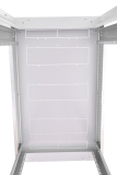 Внутри шкаф оснащён 4 вертикальными направляющими, которые можно регулировать по глубине. На юнитовые направляющие нанесена маркировка, облегчающая монтаж. В стандартном комплекте есть система заземления. Профиль вертикального швеллера дополнен улучшенной перфорацией, что позволяет использовать дополнительное пространство для монтажа разнообразных аксессуаров. Изделие поставляется разобранным в картонных коробках. Комплект поставки включает 2 транспортных места.