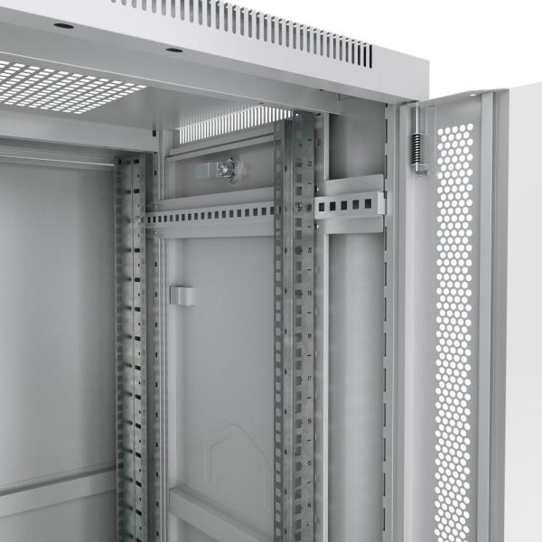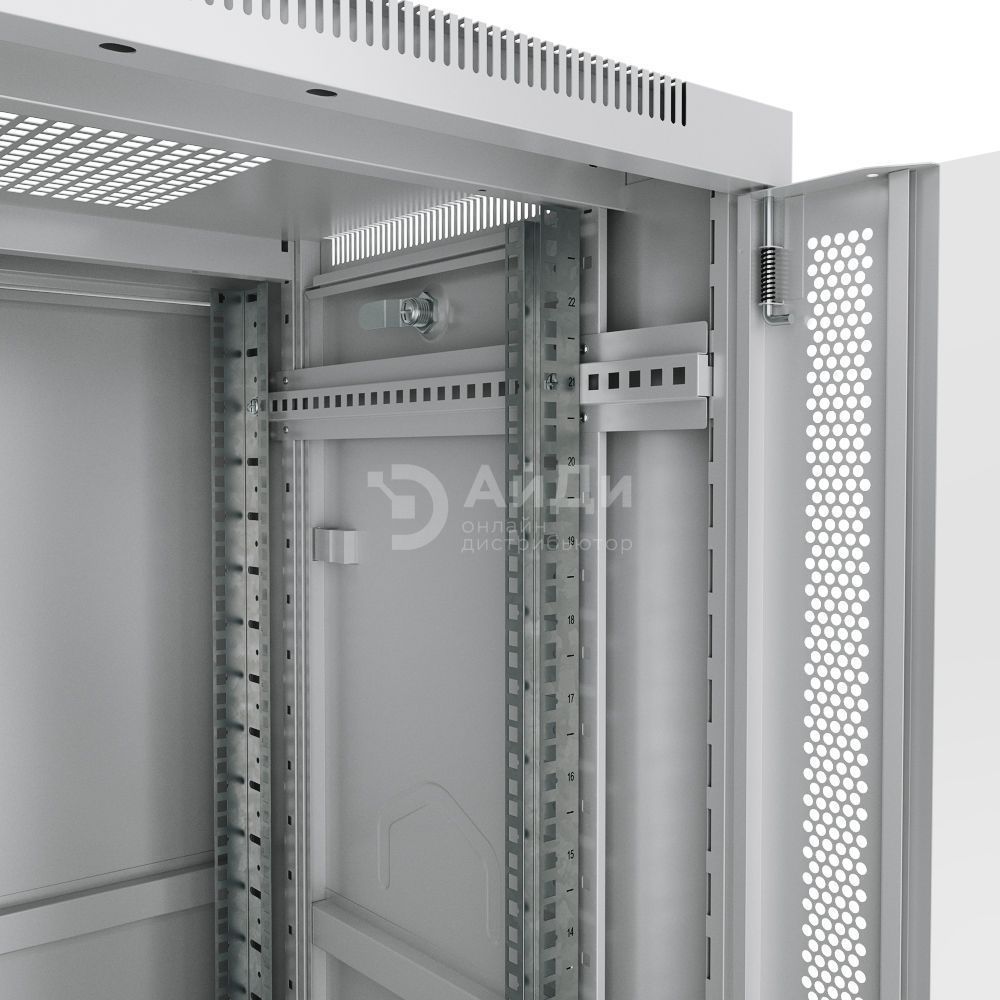 Передняя и задняя одностворчатые двери металлические с перфорацией, оснащены замками. На передней двери одноточечный замок с ручкой. С боков установлены сплошные съёмные панели, фиксируемые защёлками.