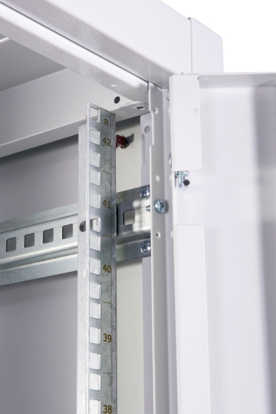 Основание и крыша приспособлены для установки вентиляторных модулей R-FAN и щёточного ввода КВ-Щ-55.420А. В качестве альтернативы, возможно установить два щёточных ввода КВ-Щ-55.210А. 19-дюймовое оборудование монтируется на оцинкованные направляющие (4 шт.) с регулировкой глубины.