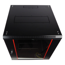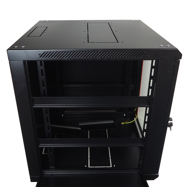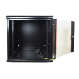Шкаф изготовлен из металла 1,2 мм с порошковым покрытием чёрного цвета RAL 9005. Распределительная нагрузка 100 кг. Размеры настенного телекоммуникационного шкафа 600х450 мм (ШхГ), 18U.