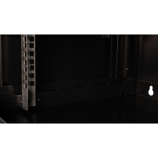 Шкаф телекоммуникационный настенный имеет разборный каркас, состоящий из продольных и поперечных рам. Задняя и боковые стенки из сплошного металла толщиной 0,5 мм, легко снимаются и фиксируются цилиндрическими замками.
