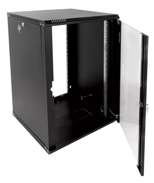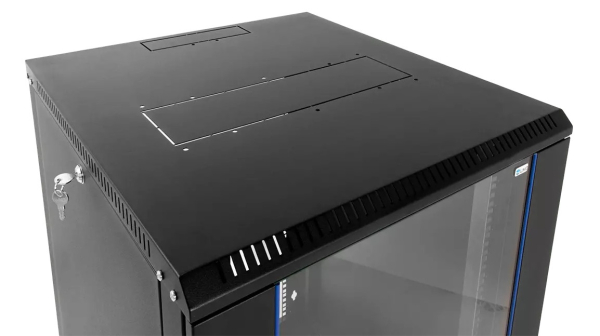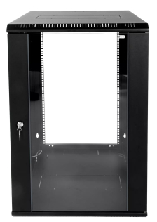 Шкаф комплектуется ударопрочной стеклянной дверью с увеличенной обзорной поверхностью. Стекло крепится механическим способом, что обеспечивает необходимую жёсткость и позволяет легко выполнить его замену при повреждениях. Навесить дверцу можно как справа, так и слева. Для защиты от несанкционированного доступа к оборудованию на дверь установлен точечный замок.
