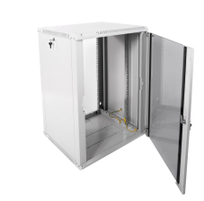 Данный шкаф комплектуется ударопрочной стеклянной дверью с увеличенной обзорной поверхностью. Стекло крепится механическим способом, что обеспечивает необходимую жёсткость и позволяет легко выполнить его замену при повреждениях. Навесить дверцу можно как справа, так и слева. Для защиты от несанкционированного доступа к оборудованию на дверь установлен точечный замок.