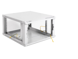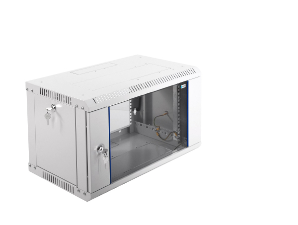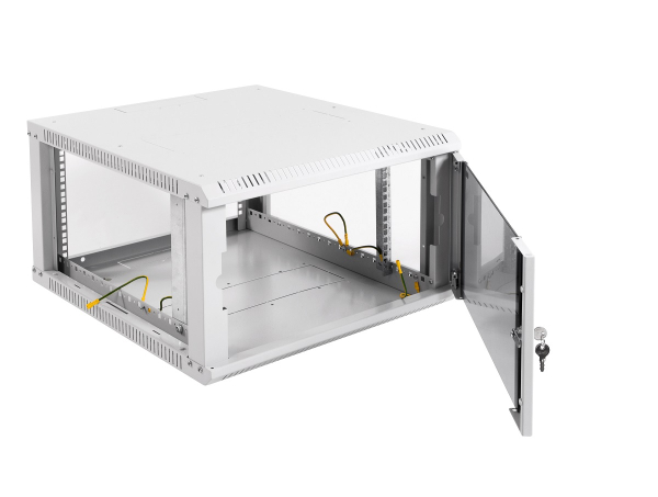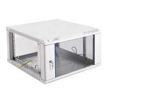 Данный шкаф комплектуется ударопрочной стеклянной дверью с увеличенной обзорной поверхностью. Стекло крепится механическим способом, что обеспечивает необходимую жёсткость и позволяет легко выполнить его замену при повреждениях. Навесить дверцу можно как справа, так и слева. Для защиты от несанкционированного доступа к оборудованию на дверь установлен точечный замок.