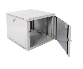 Данный шкаф комплектуется ударопрочной стеклянной дверью с увеличенной обзорной поверхностью. Стекло крепится механическим способом, что обеспечивает необходимую жёсткость и позволяет легко выполнить его замену при повреждениях. Навесить дверцу можно как справа, так и слева. Для защиты от несанкционированного доступа к оборудованию на дверь установлен точечный замок.