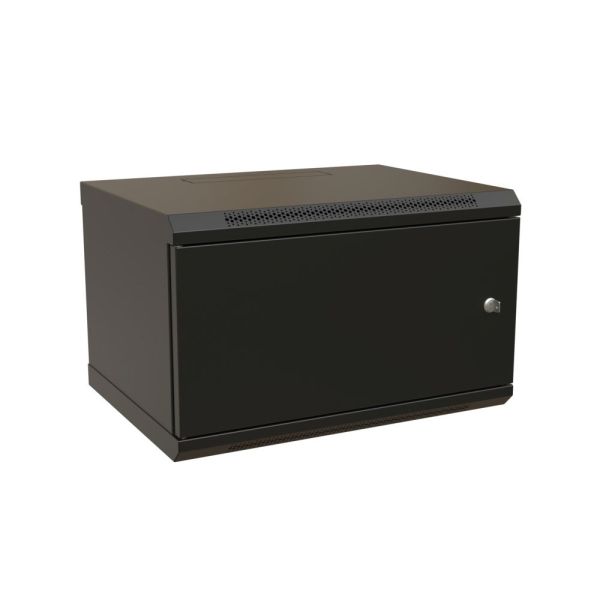 Размеры настенного шкафа WRline 9U 500 х 600 х 450 мм (ВхШхГ). Окрашен порошковой краской чёрного цвета (RAL 9004).