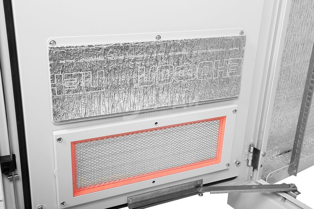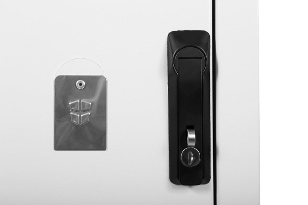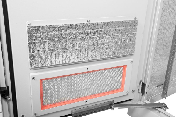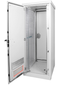 Напольный всепогодный шкаф имеет сварной металлический корпус, толщина стенок которого составляет 2 мм. Изнутри изделие покрыто слоем термоизоляции. На переднюю дверь и крышу могут устанавливаться вентиляторы МВ-400 и фильтры. Для этого предусмотрены соответствующие вентиляционные окна. Шкаф комплектуется двумя дверьми, которые могут навешиваться как справа, так и слева. Двери снабжены ограничителями и запираются на ригельные замки. Вместо задней двери возможно установить стенку.