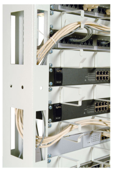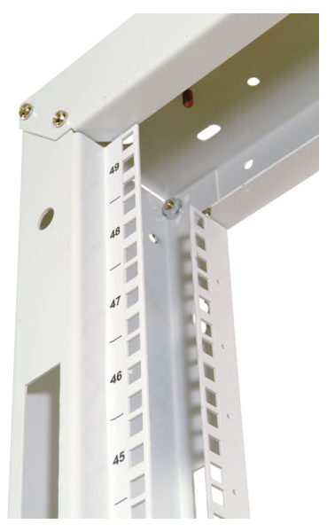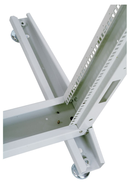 Открытые стойки просто соединяются друг с другом. Делается это через вертикальный органайзер, служащий для укладки кабелей. Изделие может крепиться к полу или устанавливаться на винтовые опоры. Для надежной установки предусмотрены специальные опорные кронштейны.