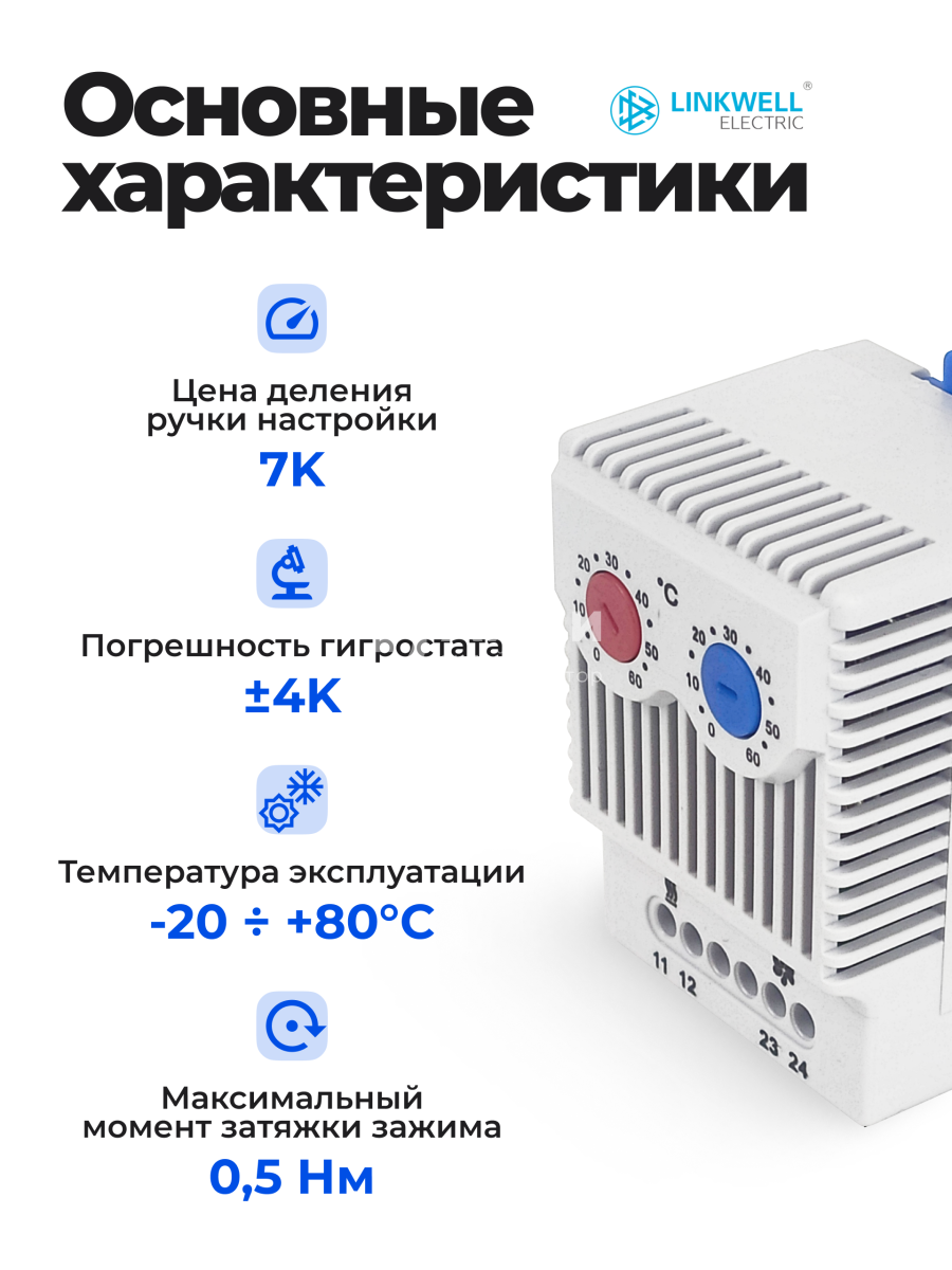 Двойной терморегулятор LINKWELL ELECTRIC ZR011 предназначен для независимого включения и выключения нагревателей и вентиляторов в диапазоне температур от 0 до +60°C. Разность температур переключения 7 K (погрешность ± 4 К). Термостат NC регулирует нагреватели. Термостат NO регулирует…