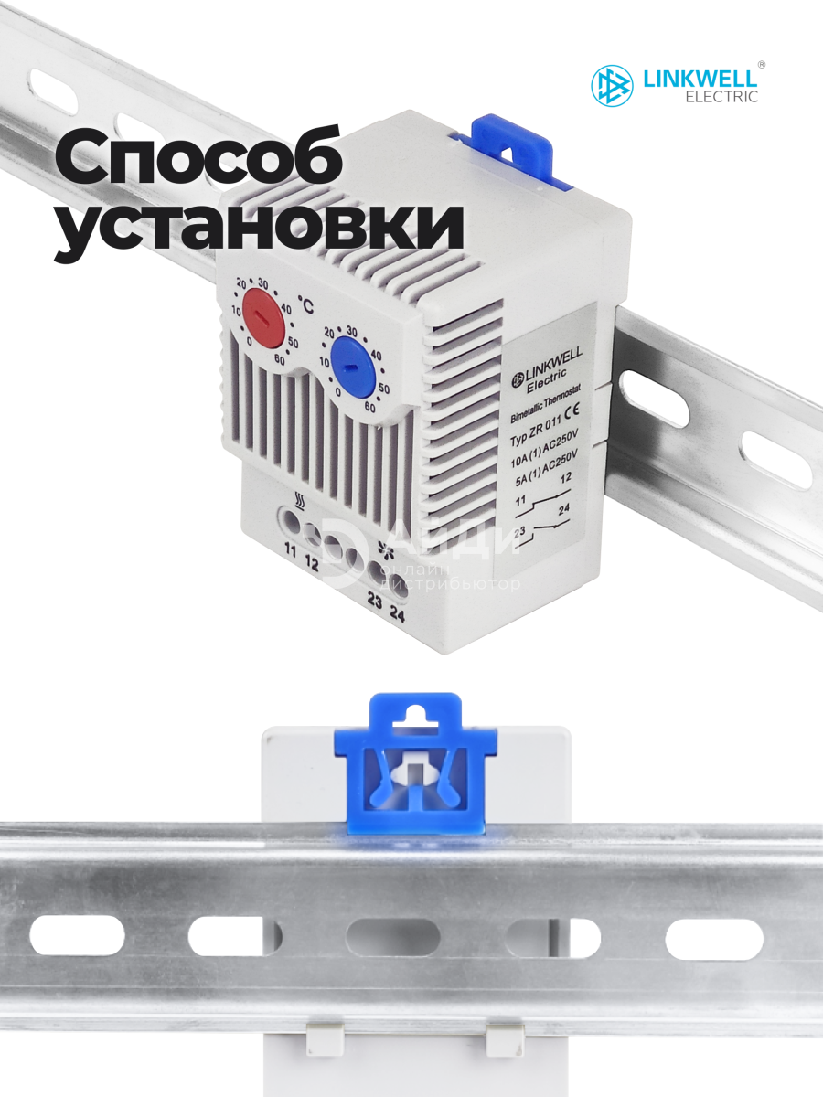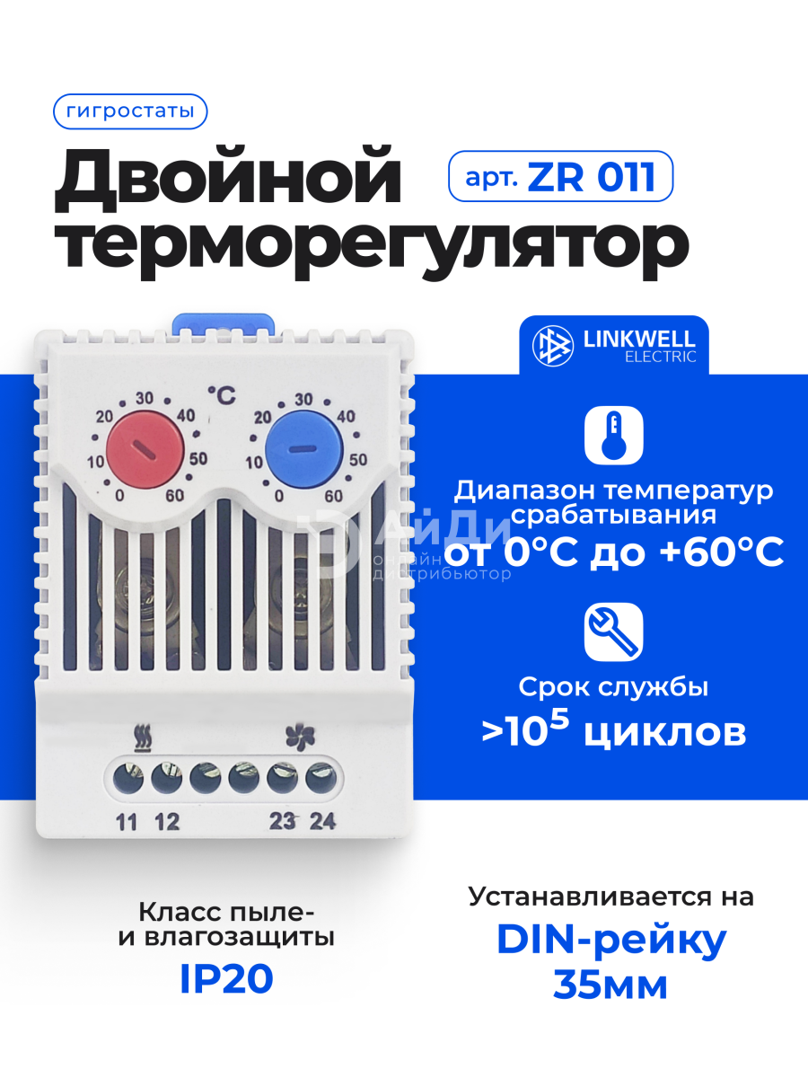 Двойной терморегулятор LINKWELL ELECTRIC ZR011 предназначен для независимого включения и выключения нагревателей и вентиляторов в диапазоне температур от 0 до +60°C. Разность температур переключения 7 K (погрешность ± 4 К). Термостат NC регулирует нагреватели. Термостат NO регулирует вентиляторы с фильтром и сигнальные датчики при превышении температуры. Приборы нагрева и охлаждения могут быть включены независимо друг от друга. Терморегулятор имеет компактный пластиковый корпус IP20, серого цвета (ВхШхГ) 67 x 50 x 46 мм. Устанавливается на DIN-рейку 35 мм. Подсоединяется четырехполюсным зажимом. Предусмотрено использование жестких проводов  2,5 мм, многопроволочных с наконечником 1,5 мм. Максимальный момент затяжки зажима 0,5 Нм. Максимальная коммутационная способность AC 250В, 10(2)A; AC 120В, 15(2)A; DC 30 Вт. Температура эксплуатации и хранения от -20 до +80 °C. Срок службы более 100 000 циклов.  Вес 90 гр. Поставляется в индивидуальной упаковке.